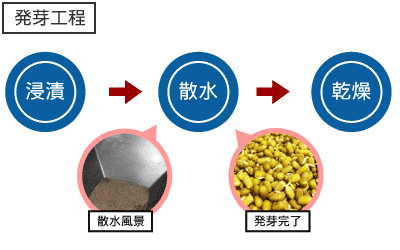 独自の発芽装置を利用することで、様々な穀物の発芽に最適な条件を設定し、完全機械化による発芽方法を行っております。 設定した時間に自動散水をし、素材の特性に合わせた最適な発芽が可能となります。